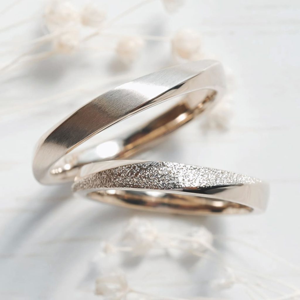 長いひねりが特徴的で、中央ラインに旦那様はヘアライン加工、奥様はスターダスト加工を施しています。