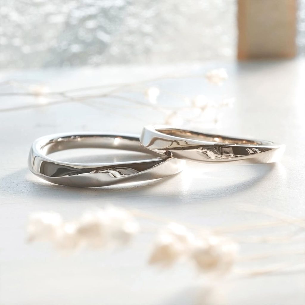 ひねりデザインが特徴的な手作り結婚指輪 旦那様はプラチナ900素材、奥様はK18シャンパンゴールド素材 どちらも鏡面仕上げ