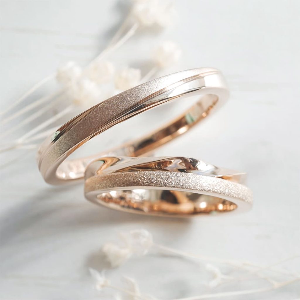 どちらもK18ピンクゴールド素材の手作り結婚指輪。 長いラインがスタイリッシュな旦那様リングと 上下のデザインを分けて作製した奥様のリング。