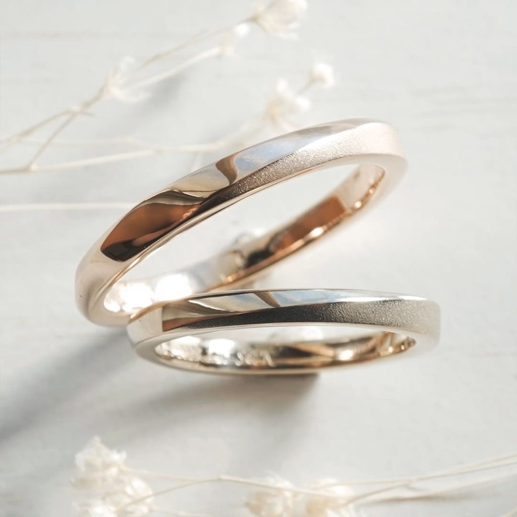 長いひねりが特徴的な手作り結婚指輪。 旦那様はK18ピンクゴールド素材、奥様はK18シャンパンゴールド素材でお作りしています。 中央ラインは鏡面仕上げ、周りはホーニング加工を施しています。