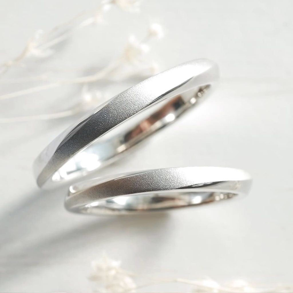 長いひねりが特徴的な手作り結婚指輪。 素材はどちらもプラチナ900素材です。 中央ラインはホーニング加工を施しています。