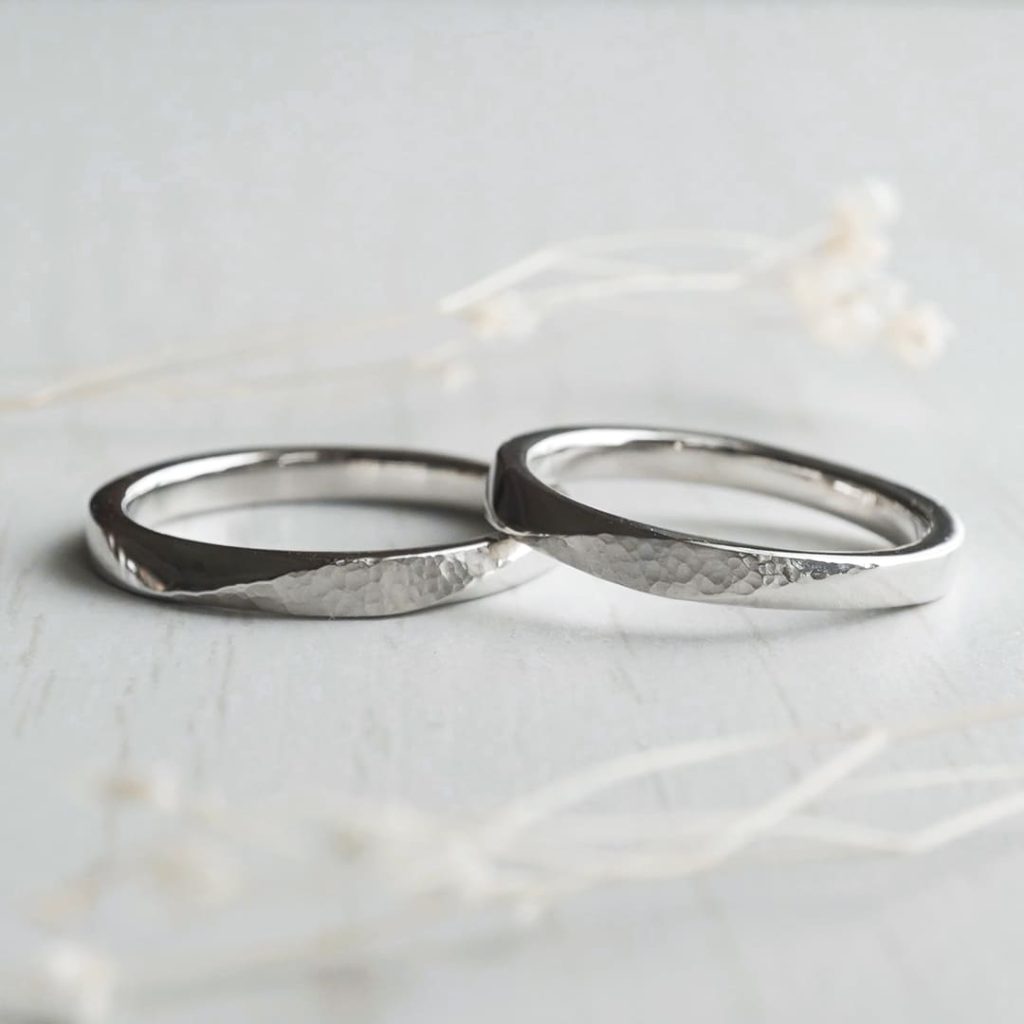 中央ラインに細かな槌目をハンマーで加えた結婚指輪。 素材はどちらもプラチナです。