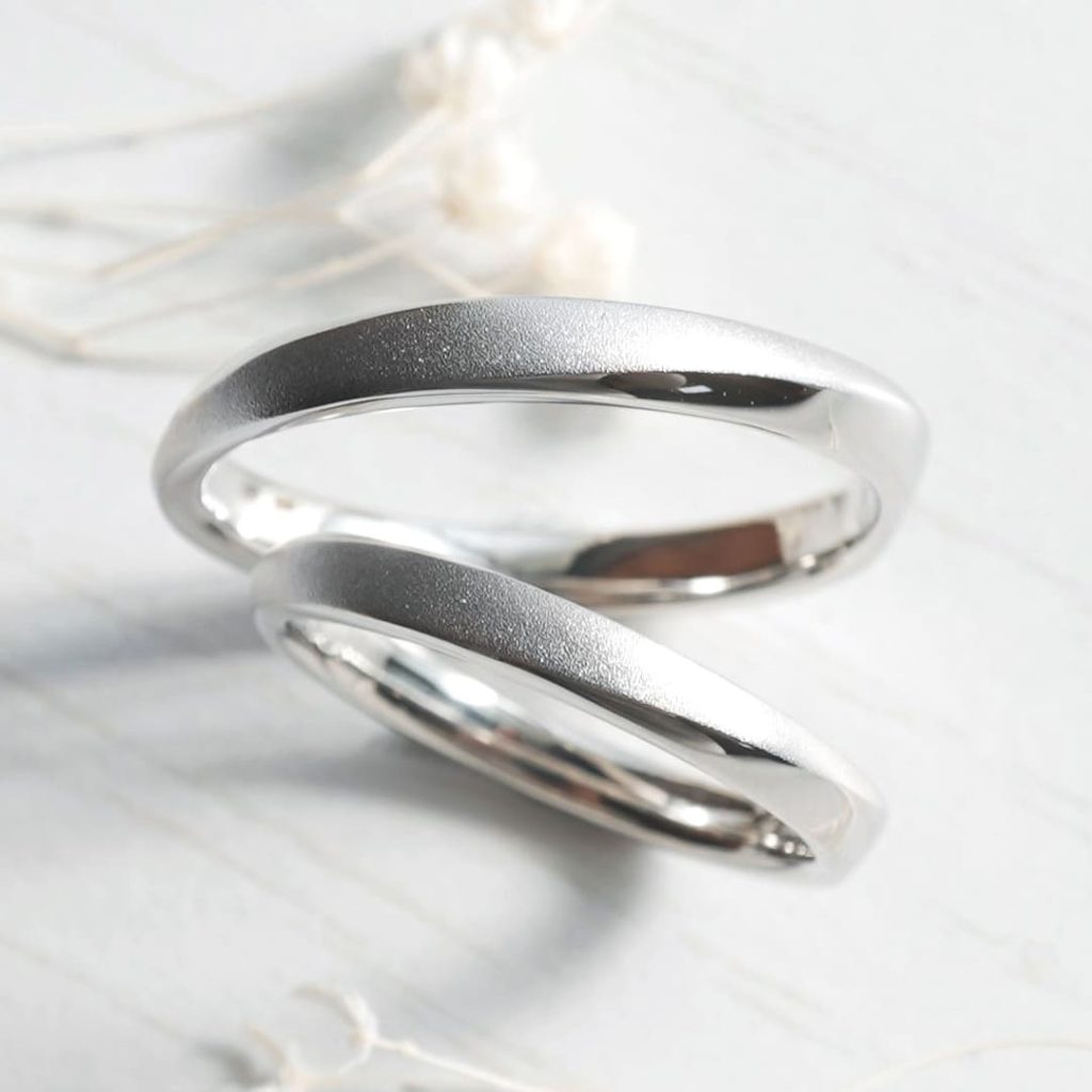 長いひねりが特徴的な手作り結婚指輪。 艶消しと鏡面の仕上げを分けて作製しています。