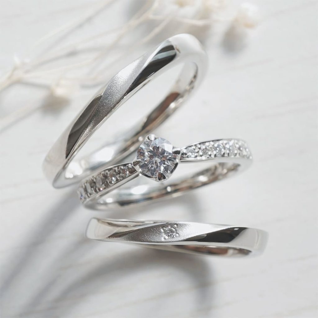 結婚指輪はワックスCOURSEで手作りいただき、中央の婚約指輪はオーダーメイドでお作りさせていただきました。