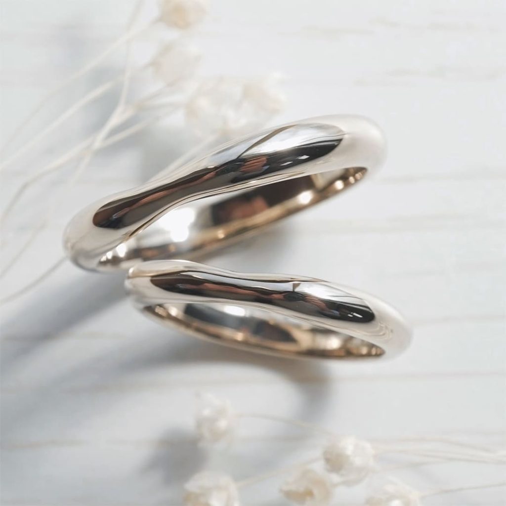波打つウェーブが完全オリジナルな手作り結婚指輪。 どちらも素材はK18シャンパンゴールドです。