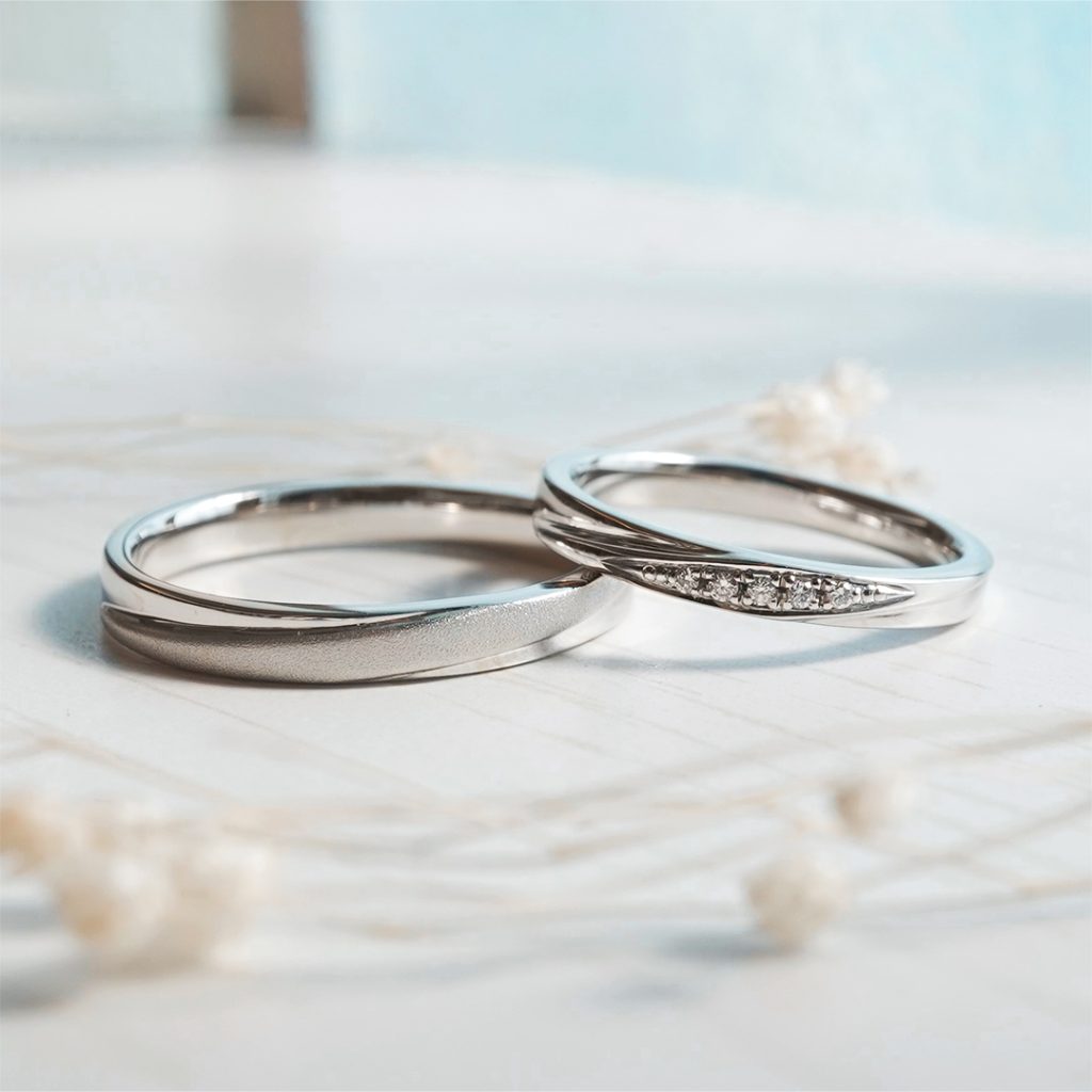 どちらもプラチナ素材の手作り結婚指輪。 浮き上がった中央ラインが美しいデザインです。 旦那様はラインにホーニング加工、奥様はダイヤモンドを留めています。