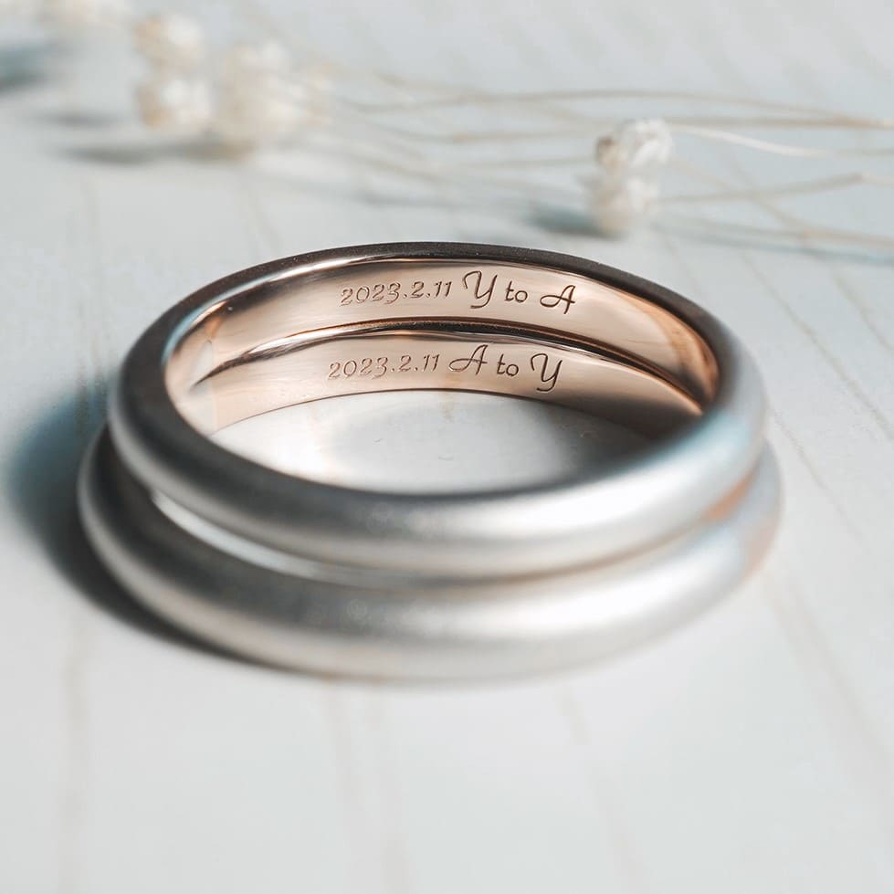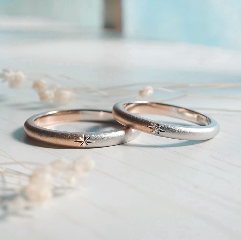 K18ピンクゴールドとプラチナ900素材の手作り結婚指輪。 どちらも素材の境目で星彫り加工を施し、奥様はダイヤモンドを留めいています。