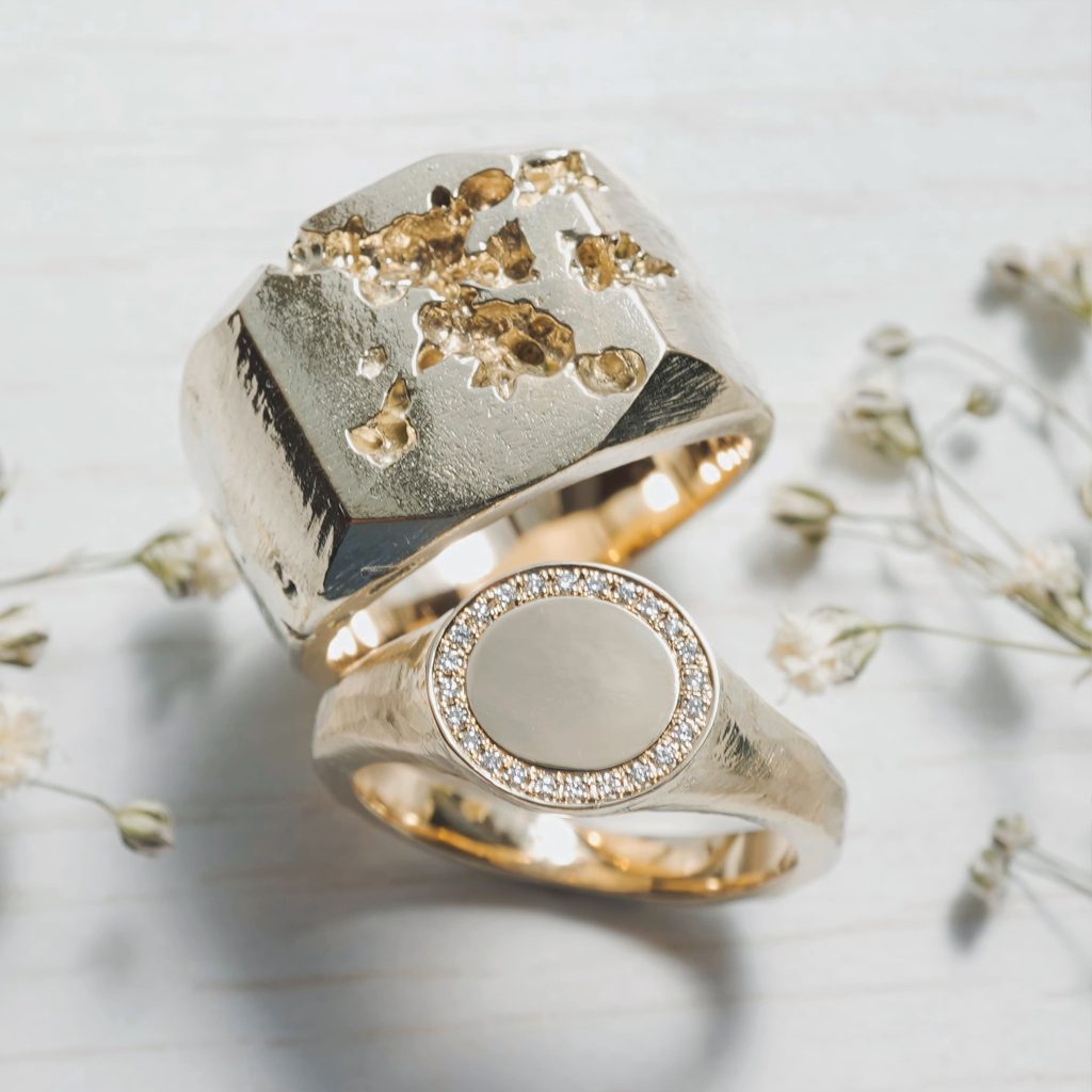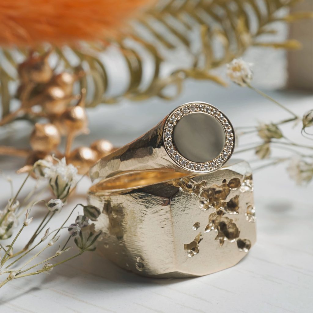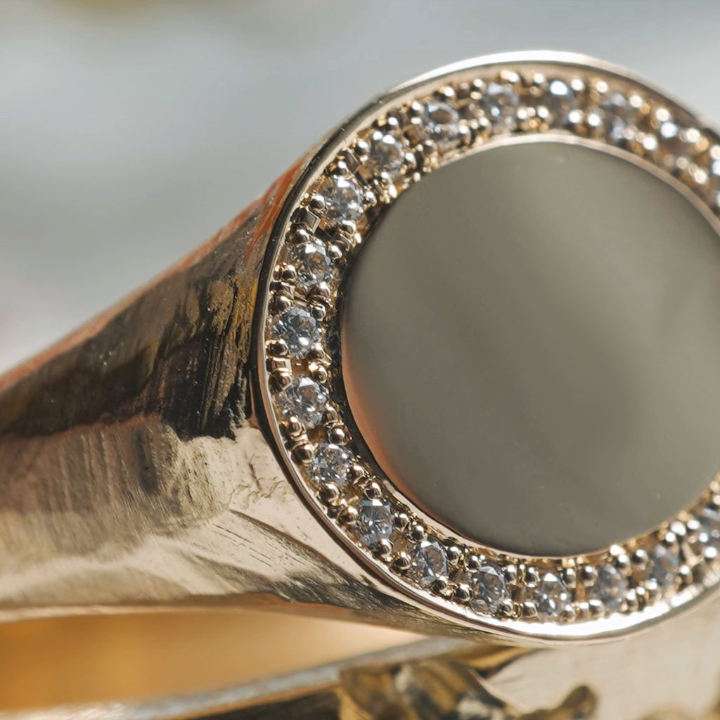 K14素材の印台リング 旦那様はスクエア調の八角のデザイン 奥様は楕円のデザインです ダイヤモンドは円に沿ってダイヤモンドを24ピース留めています
