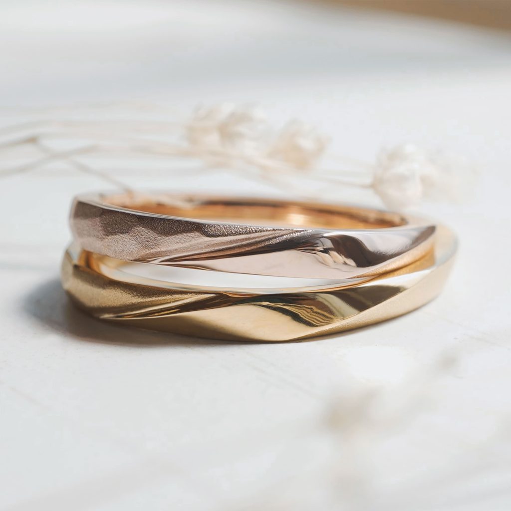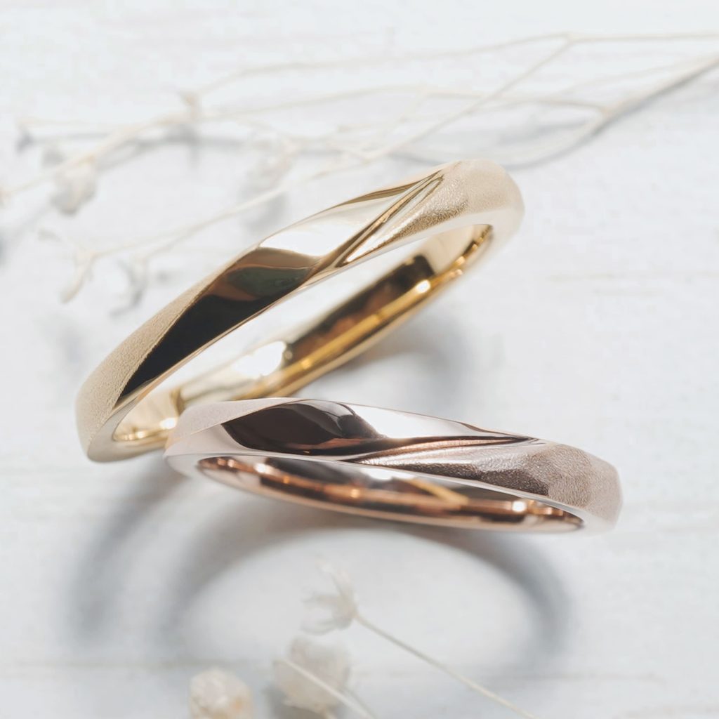 ひねりデザインに槌目を足した手作り結婚指輪 素材はK18ピンクゴールドとK18イエローゴールドです