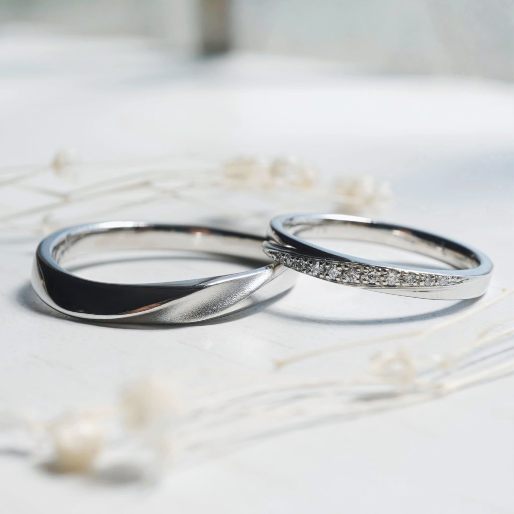 ひねりデザインに窪みを足したデザインと ストレートデザインにラインを浮かしたデザインの手作り結婚指輪 素材はどちらもプラチナです