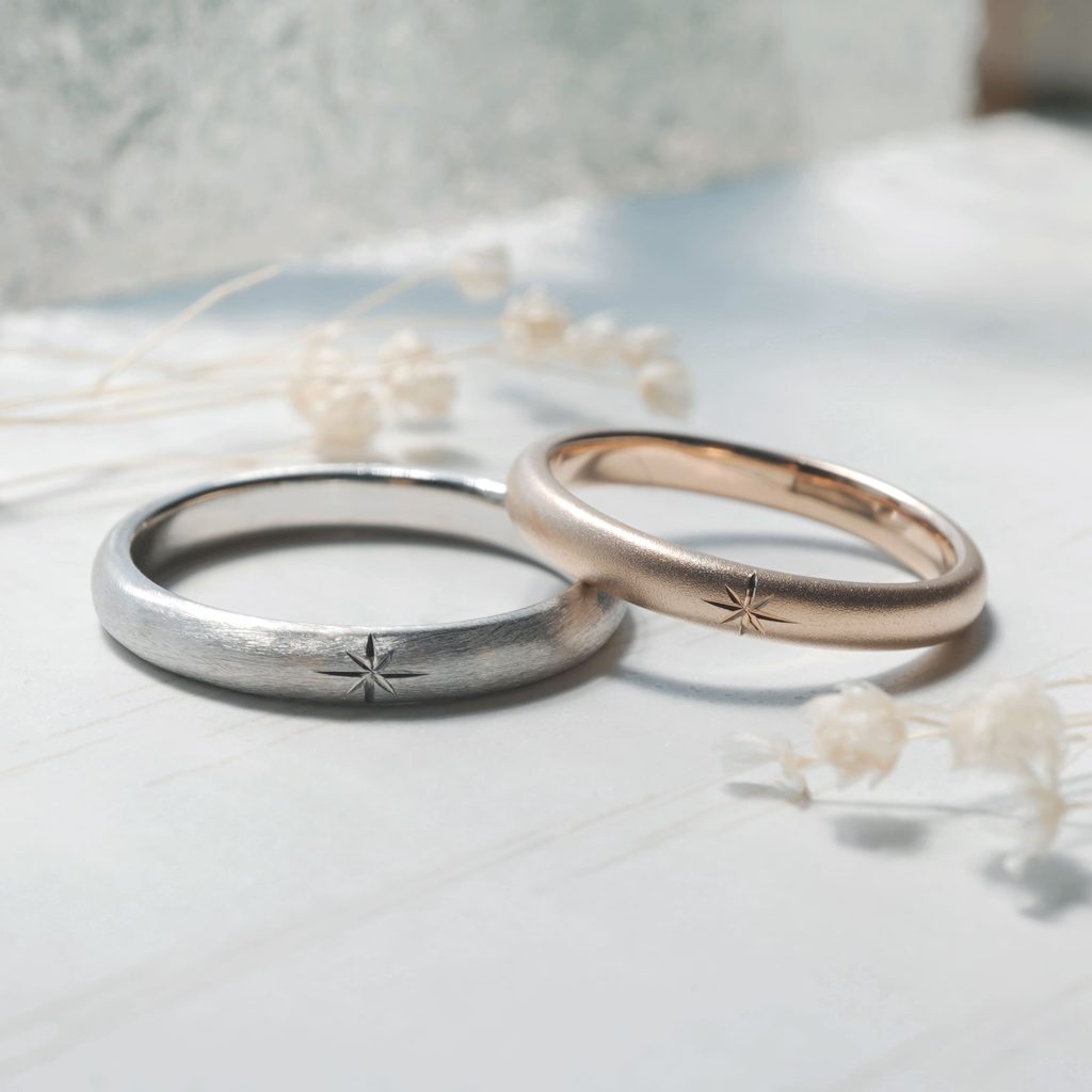 優しい雰囲気の甲丸デザイン 旦那様はプラチナ素材で 表面にヘアラインと星彫り加工 奥様はピンクオールド素材に ホーニング艶消しと星彫り加工
