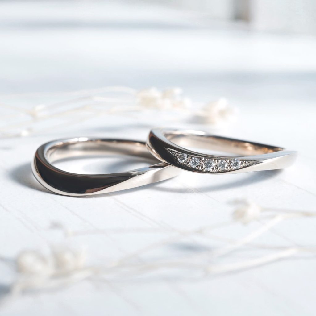 ひねりの境目美しいデザインの手作り結婚指輪 素材はどちらもシャンパンゴールド 奥様リングはダイヤモンドが5石留めっています