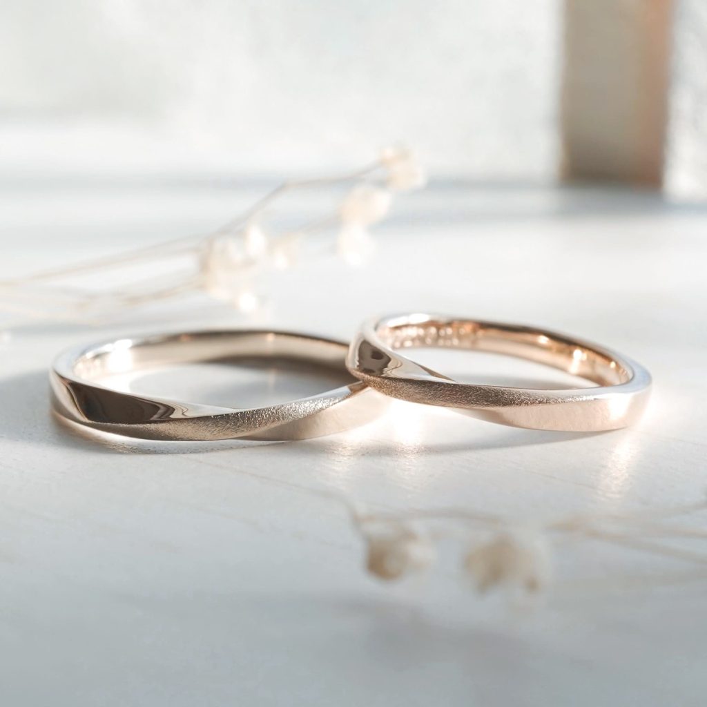 K18シャンパンとK18ピンク素材 どちらも捻じれデザイン 中央ラインは光沢感ある梨地加工仕上げ