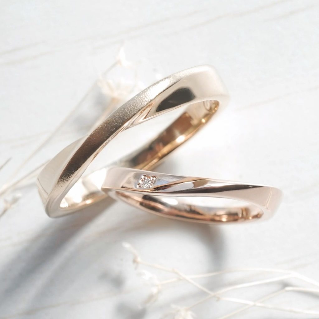 メンズはメビウスデザイン、ラインには光沢梨地加工 レディースはひねりとウエーブのデザイン、片側にダイヤを1石留めています