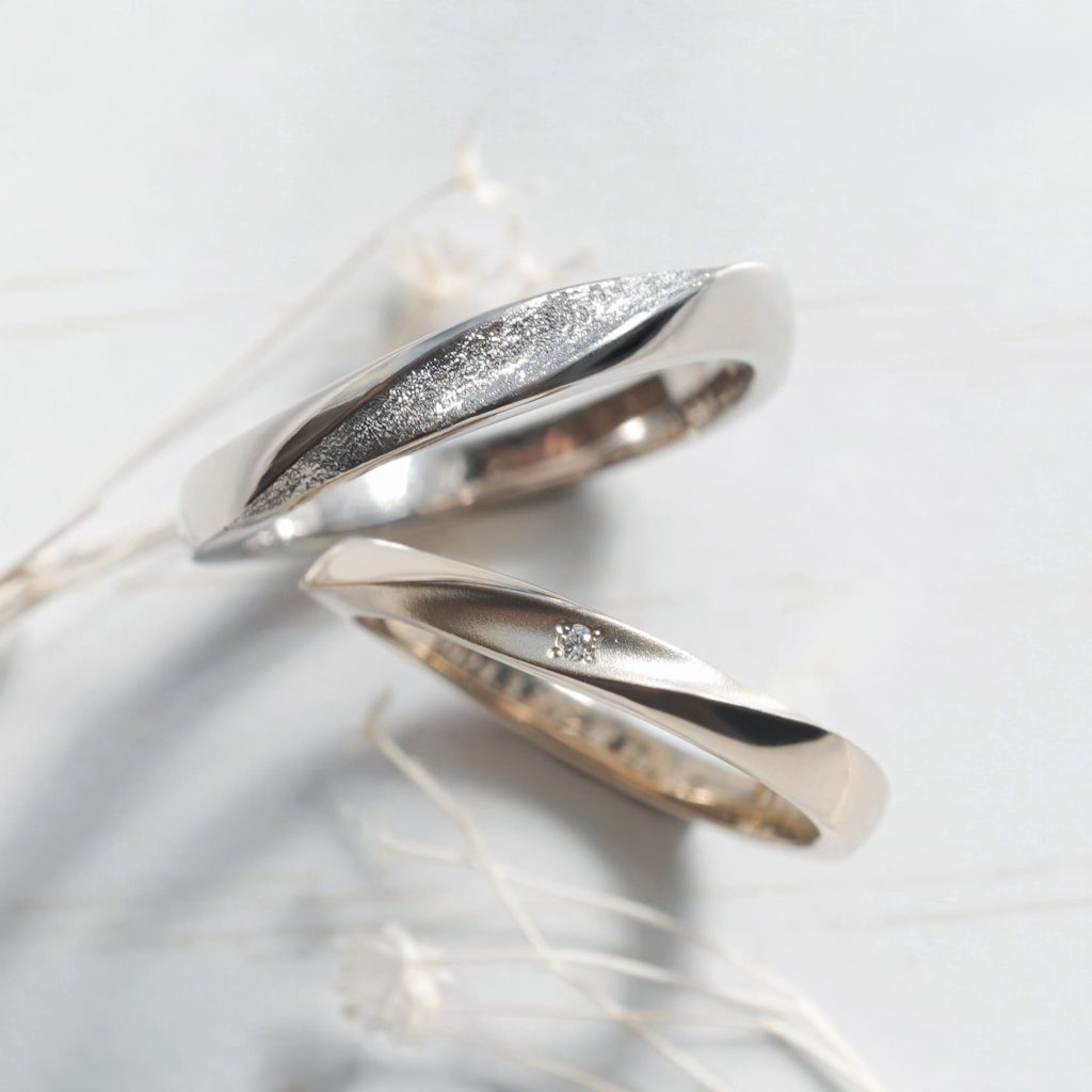 ひねりデザインに表面加工を施しています。 Men'sはスターダスト加工 (素材:Pt900) Lady'sはホーミング加工 (素材:K18シャンパンゴールド)