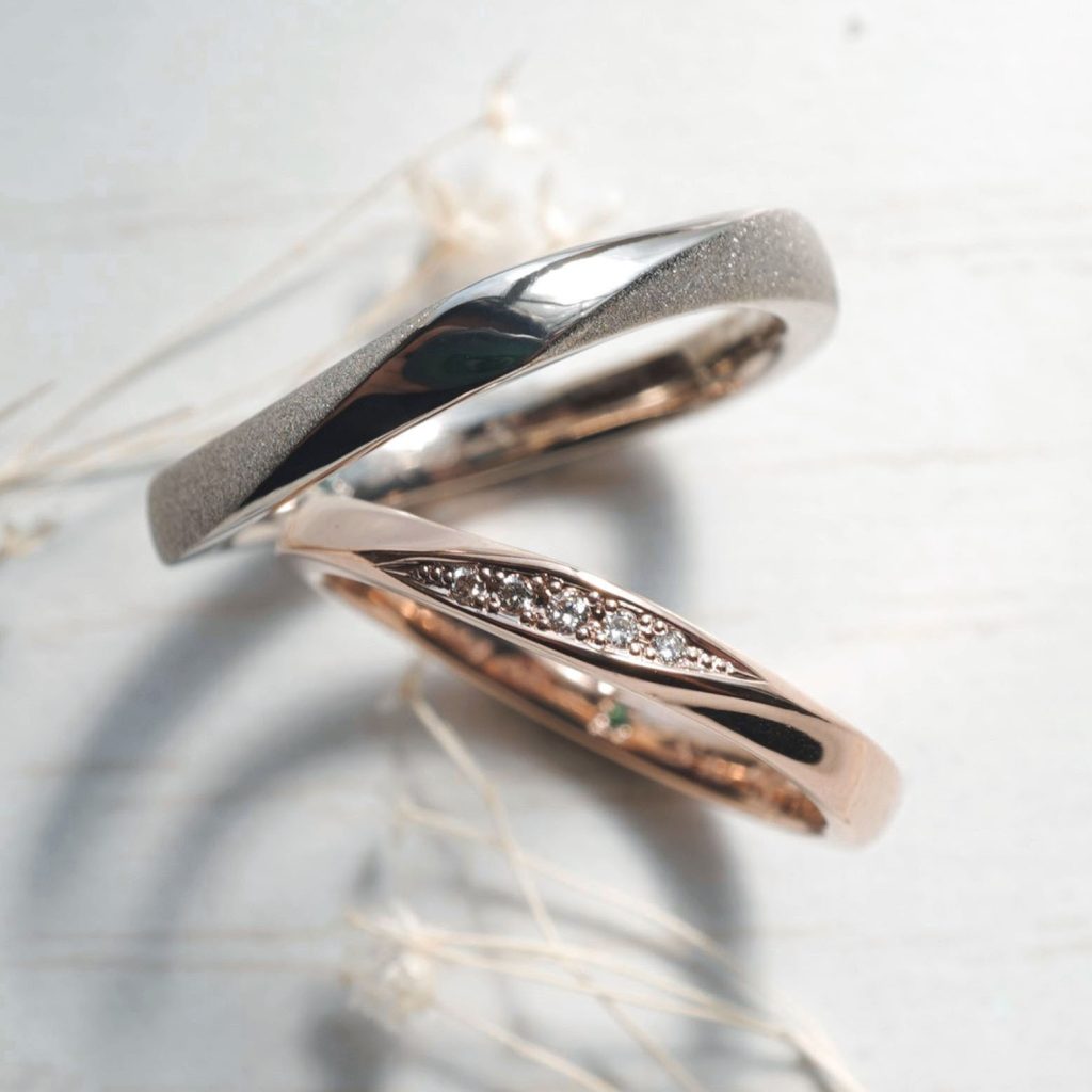 Men'sリングはK18ブラックゴールド、 Lady'sリングはK18ピンクゴールドを使用。 表面にダイヤモンドを5石留めています。