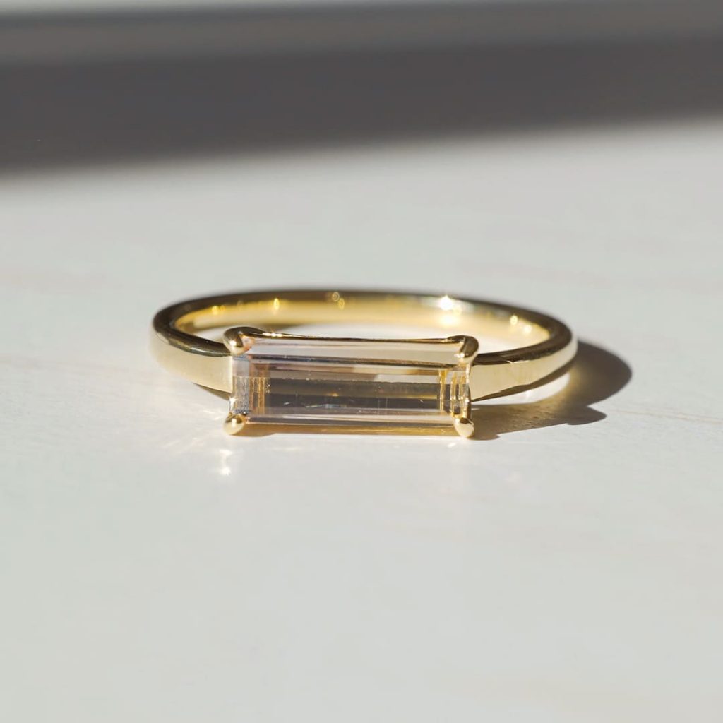 無色透明に見える石は、見る角度によって淡く紫色や黄色に輝きます。