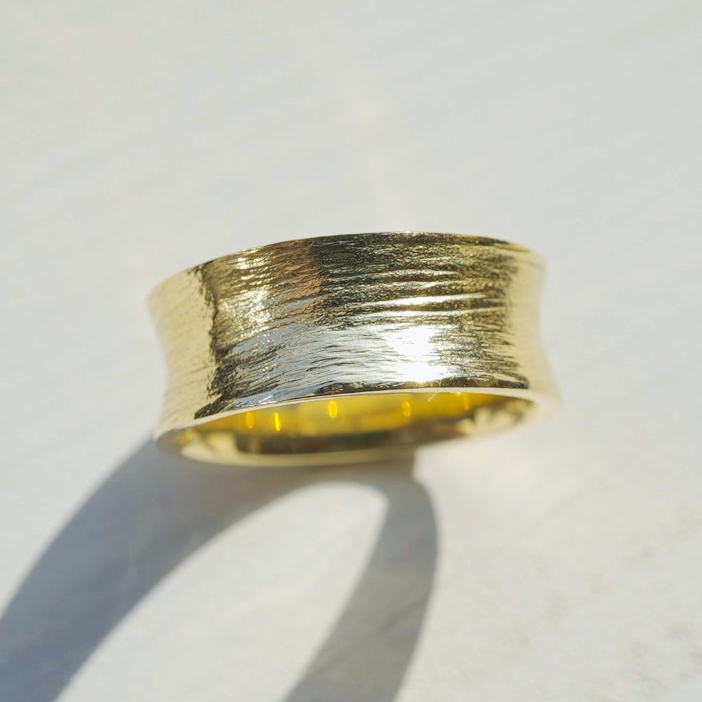 太めの逆甲丸リング。横筋はオリジナル。光沢もあり、つや消しのような表面。K14イエローゴールド素材。