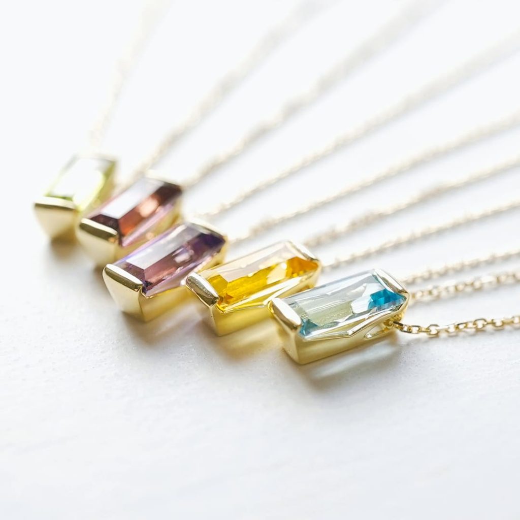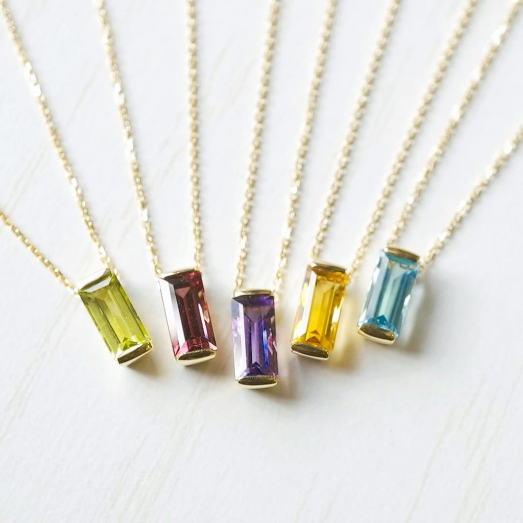 スクエアタイプの誕生石(再販可能)、左からペリドット、ガーネット、アメジスト、トパーズ、ブルートパーズ。