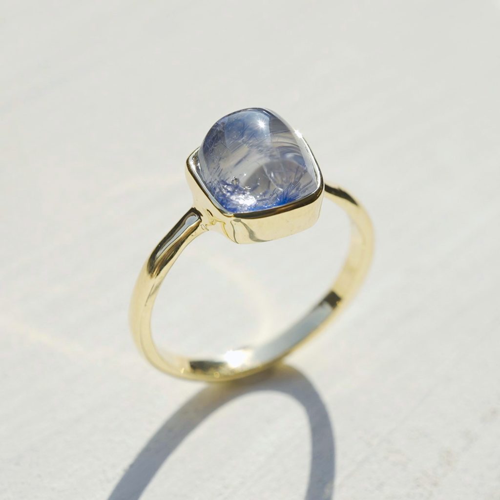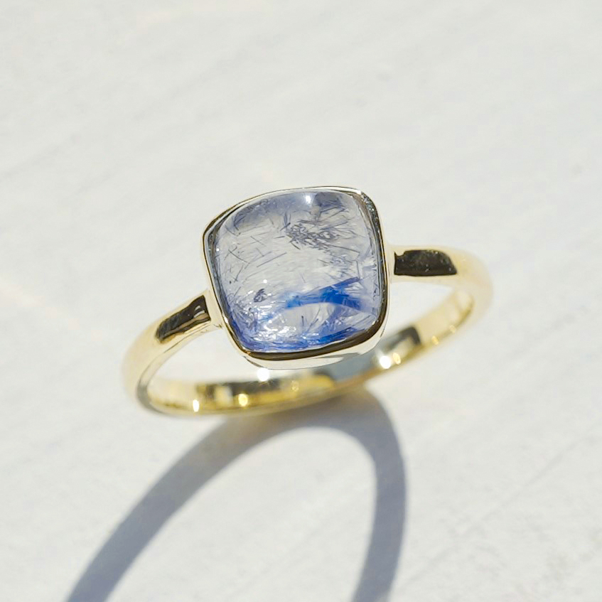 スクエア変形タイプのディモルチェライト。青い筋が可愛く輝きます。リング枠はK10イエローゴールド。