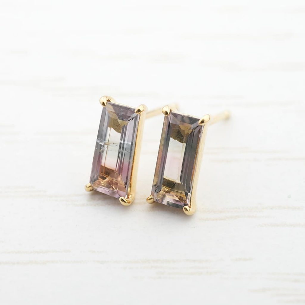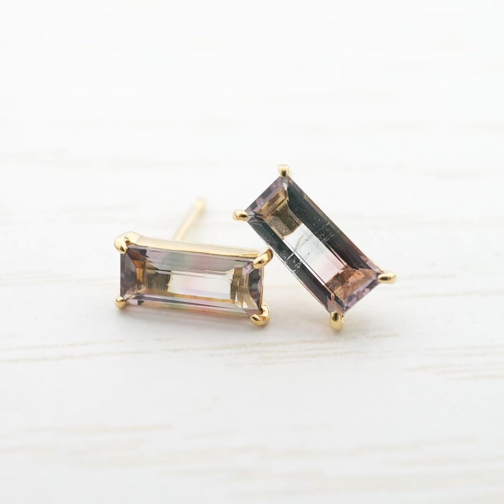 1点もの。僅かに輝く緑色とピンク色、紫色のバイカラートルマリンをピアスに仕上げました。それぞれ個性的な内包物も特徴的。
