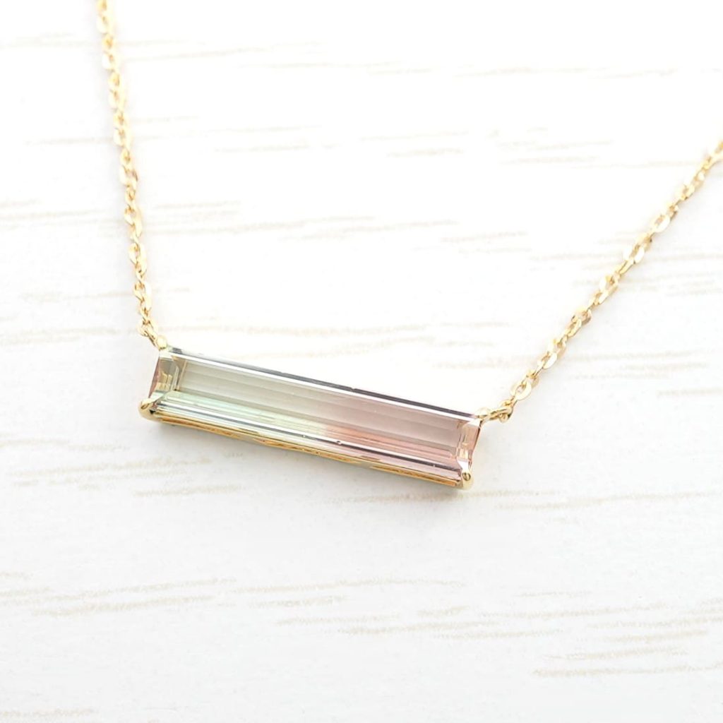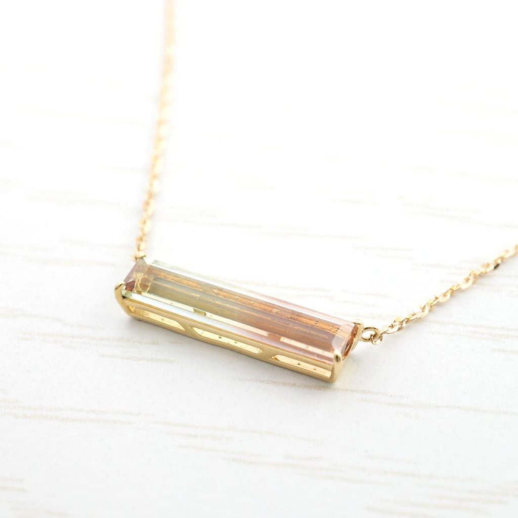 1点もの。透明感あるピンク色と若草色が特徴的なバイカラートルマリン。石枠・チェーンはK18イエローゴールド素材。長さ45cm、長さ調節可能。