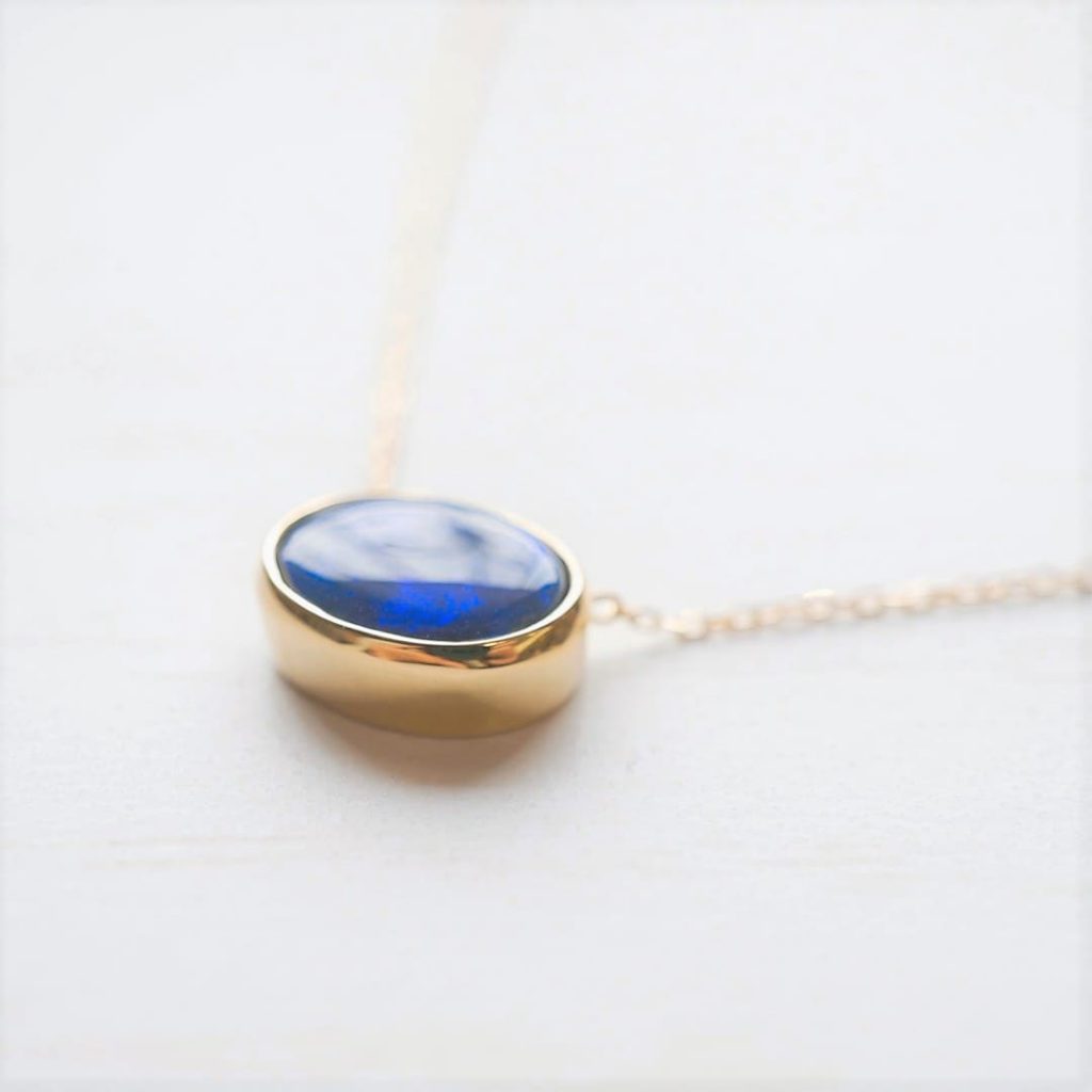 オーバルタイプのブラックオパールをK18イエローゴールド枠で覆輪留めしています。