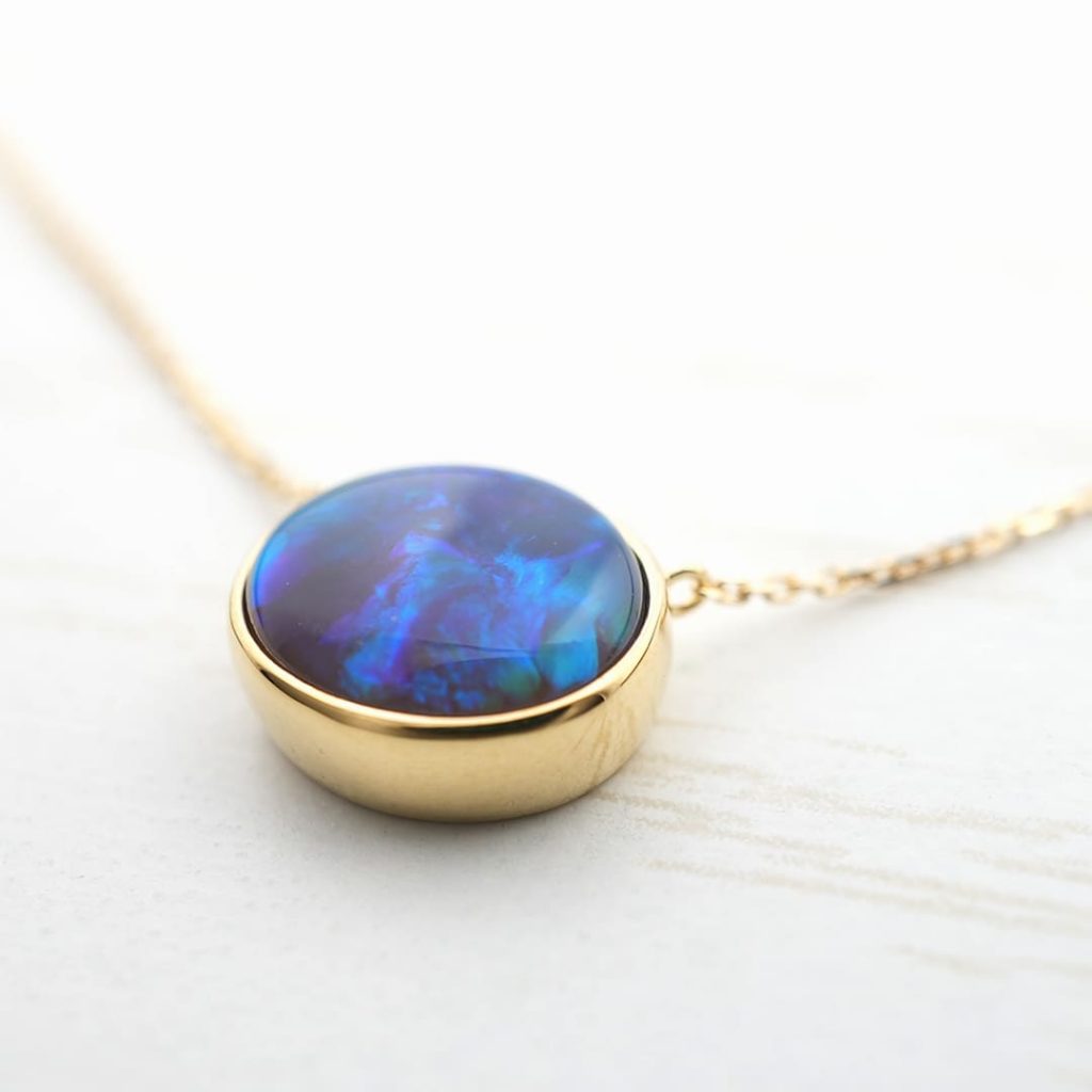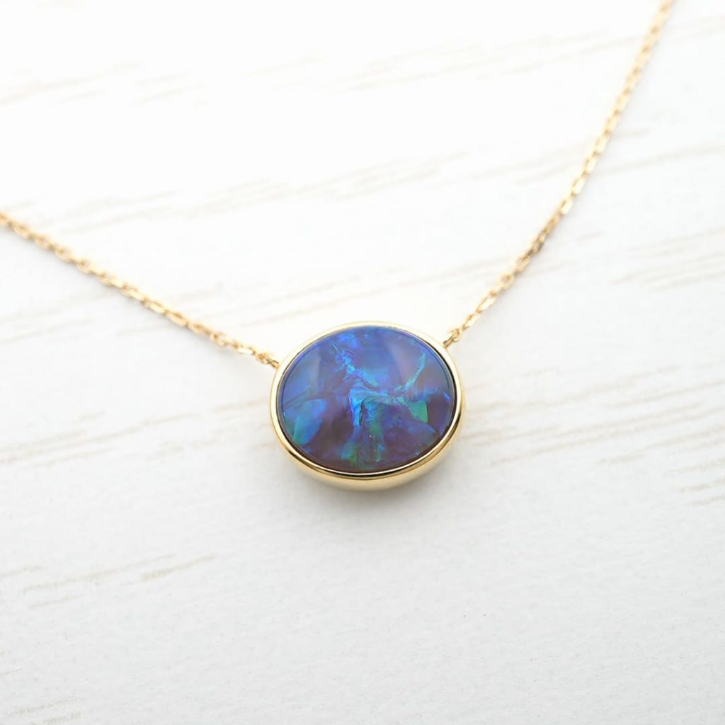 オーバルタイプのブラックオパールをK18イエローゴールド枠で覆輪留めしています。