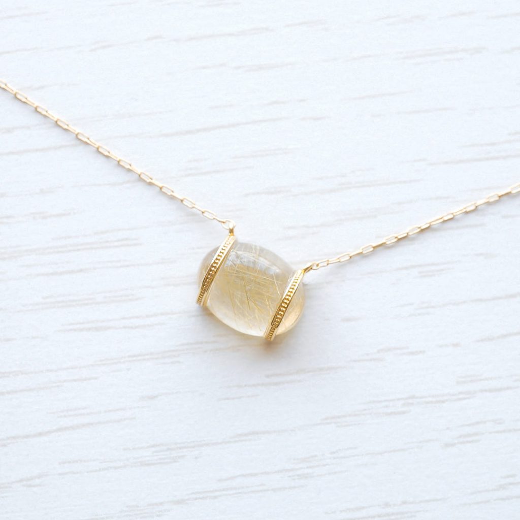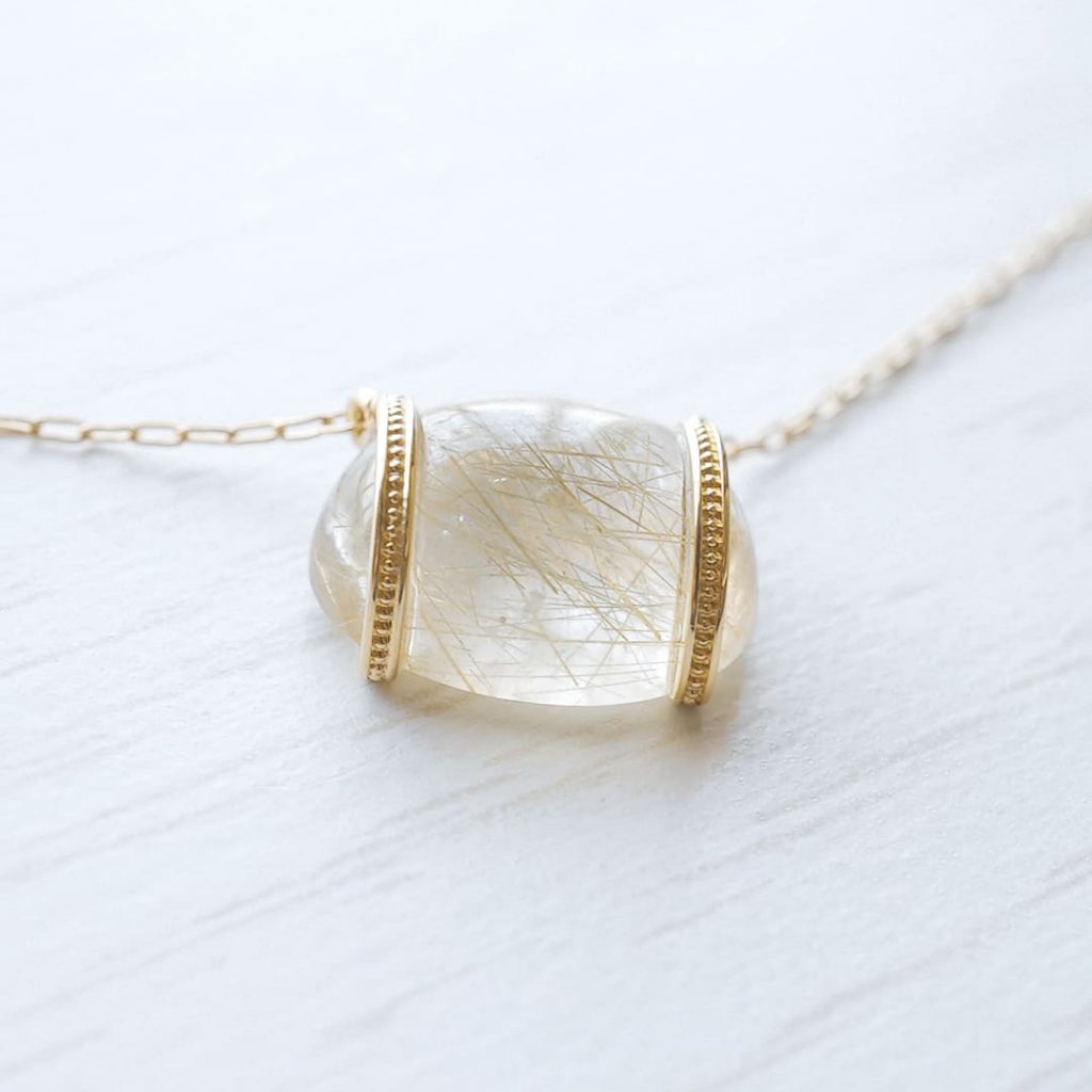 楕円の可愛い形。白く爽やかな黄金が光るデザインのルチルクオーツを両脇で留めました。